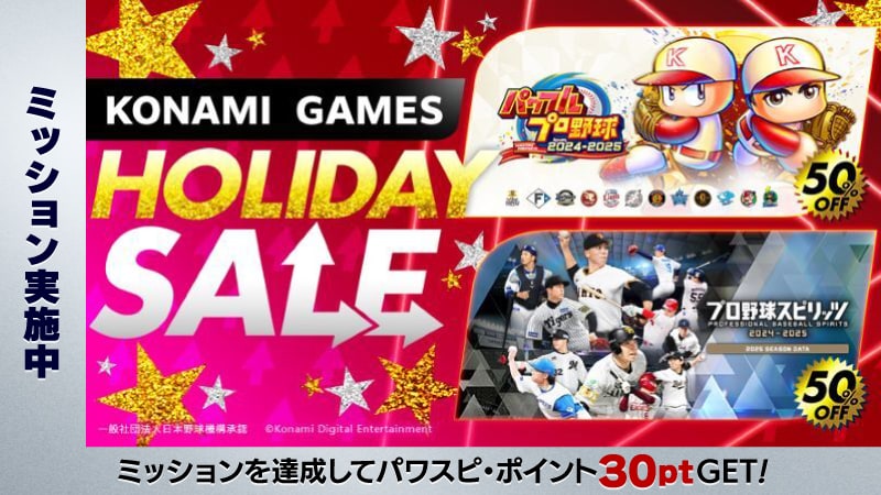 【ミッション達成でパワスピ・ポイント30pt!】KONAMI 「HOLIDAY SALE」 開催中!『パワフルプロ野球2024-2025』、『プロ野球スピリッツ2024-2025』が50%オフ!