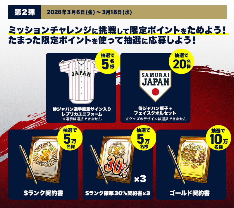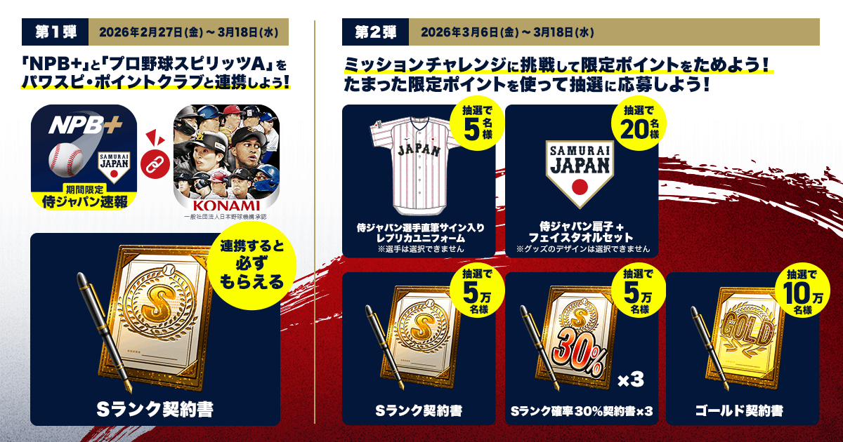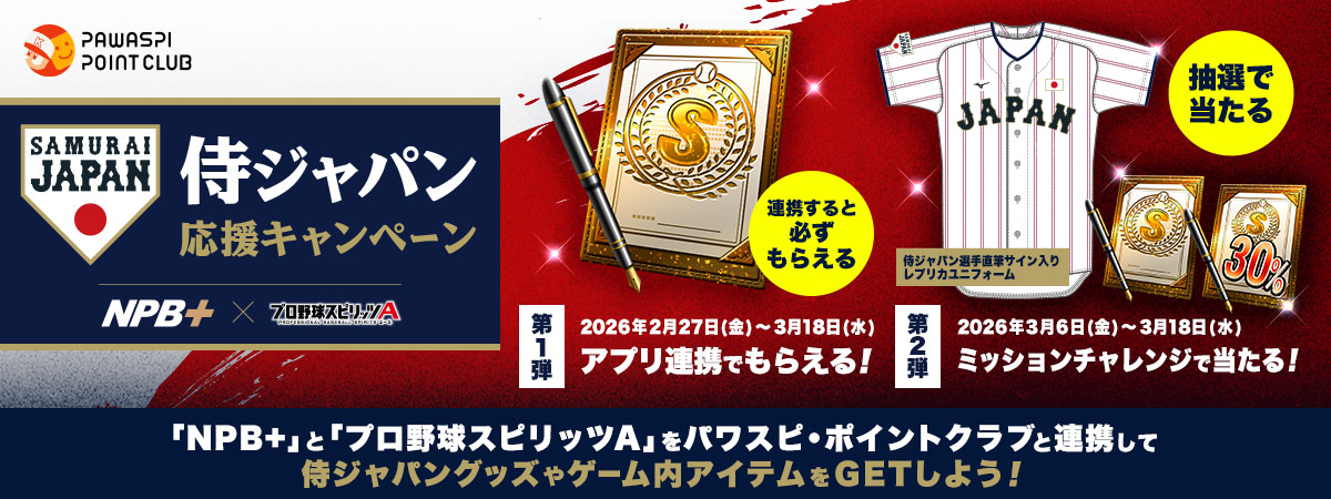 ①期間中に「プロスピA」と「NPB+」の限定ミッションを達成すると、応募につかえるポイント「侍ジャパン応援ポイント(期間・用途限定)」が獲得できます。