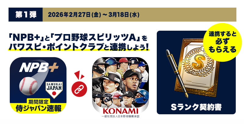 「プロスピA」と「NPB+」の両アプリをパワスピ・ポイントクラブと連携すると、Sランク契約書との交換につかえるポイント「Sランク契約書交換用ポイント(期間・用途限定)」が獲得できます!