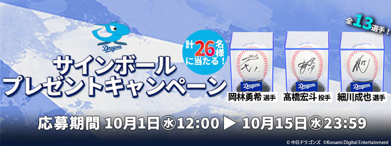 髙橋宏斗投手や岡林勇希選手など13選手(各2個)のサイン入りボールが合計26名様に当たります!