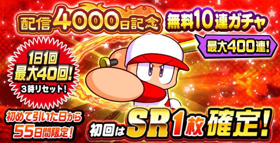 ※55日間のうち、40回まで「配信4000日記念 最大400連!無料10連ガチャ」を引くことができます。